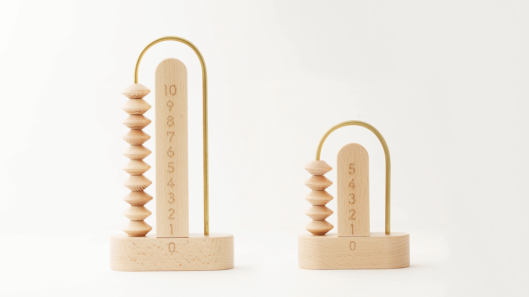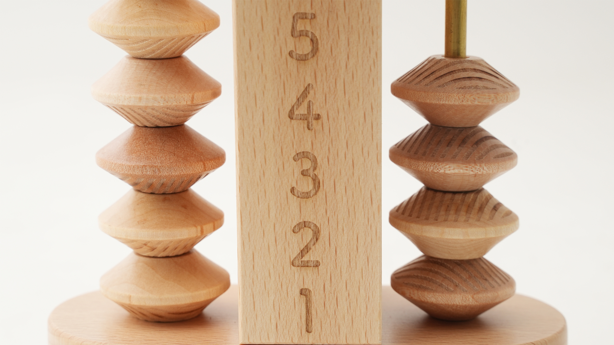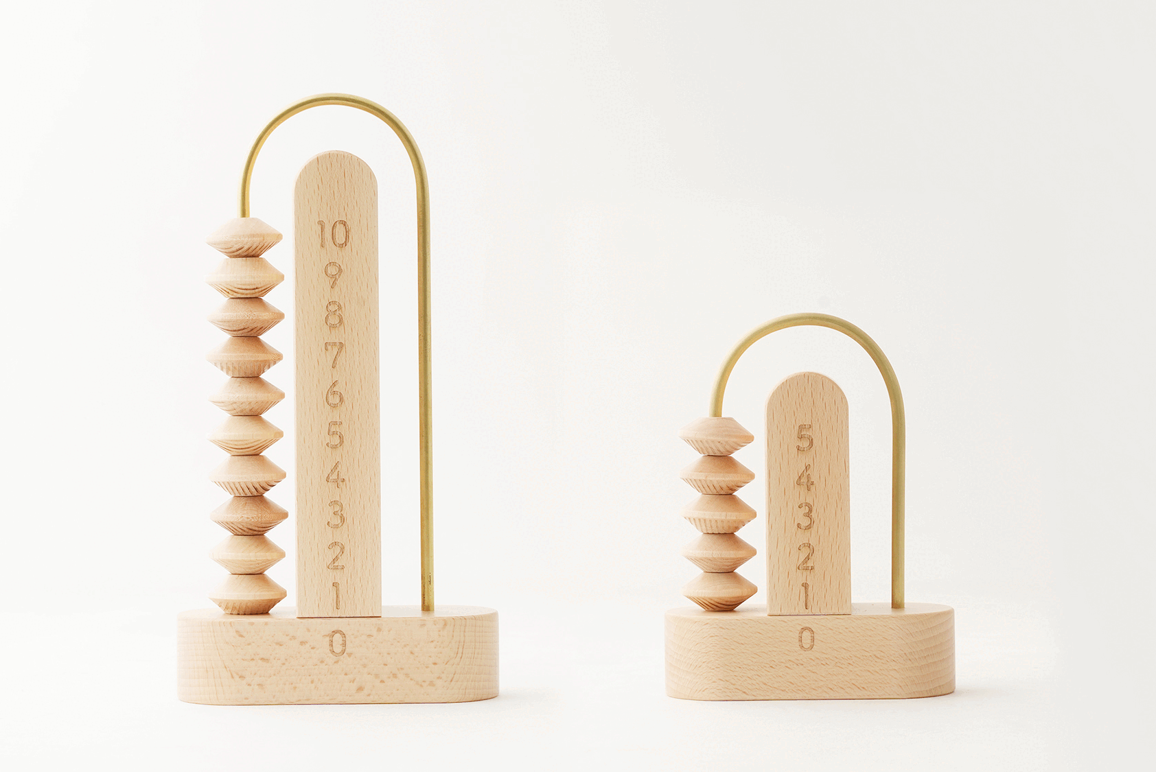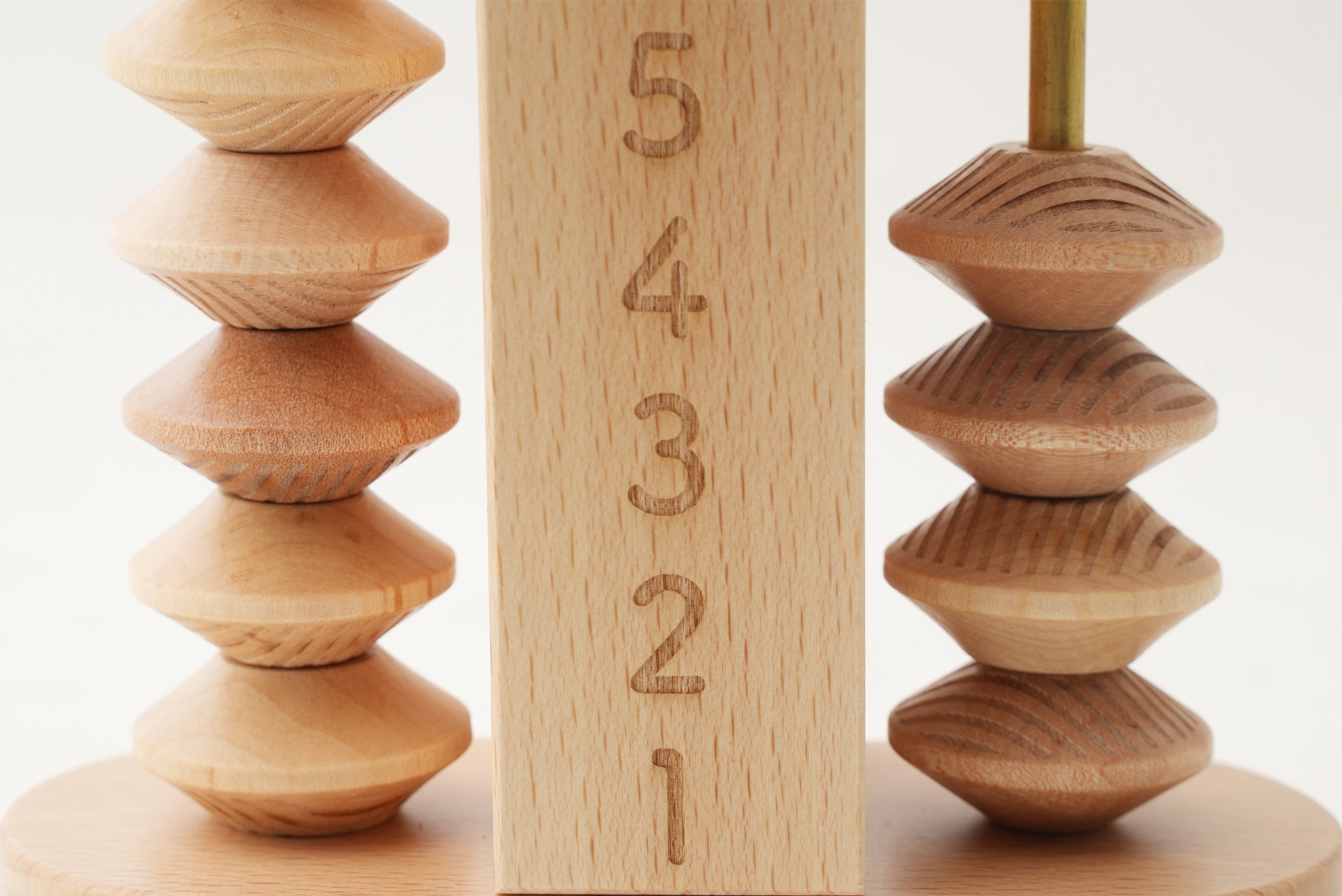 Equal 5 and 10 are educational toys co-designed by a speech pathologist and a product designer using the traditional learning methods and crafting techniques of the Banshu abacus, an officially recognized traditional craft from Ono in the Hyogo prefecture. The numbers in the front are written vertically and the ones on the back are written horizontally. For the face-to-face learning session, we recommend setting the product upright while placing it sideway is more suitable for self-study. You will enjoy the clicking sound and texture of the wooden beads. This abacus makes learning fun!