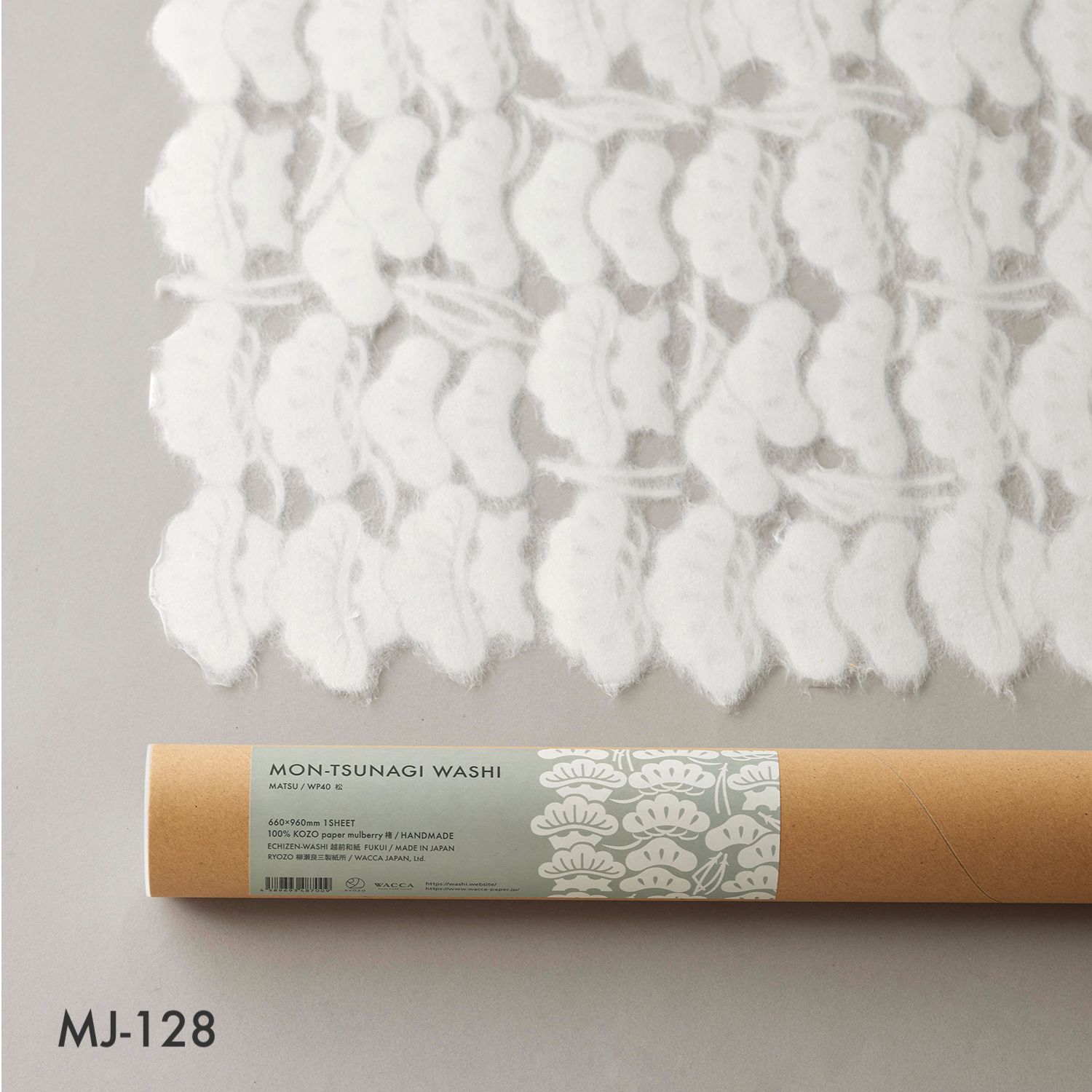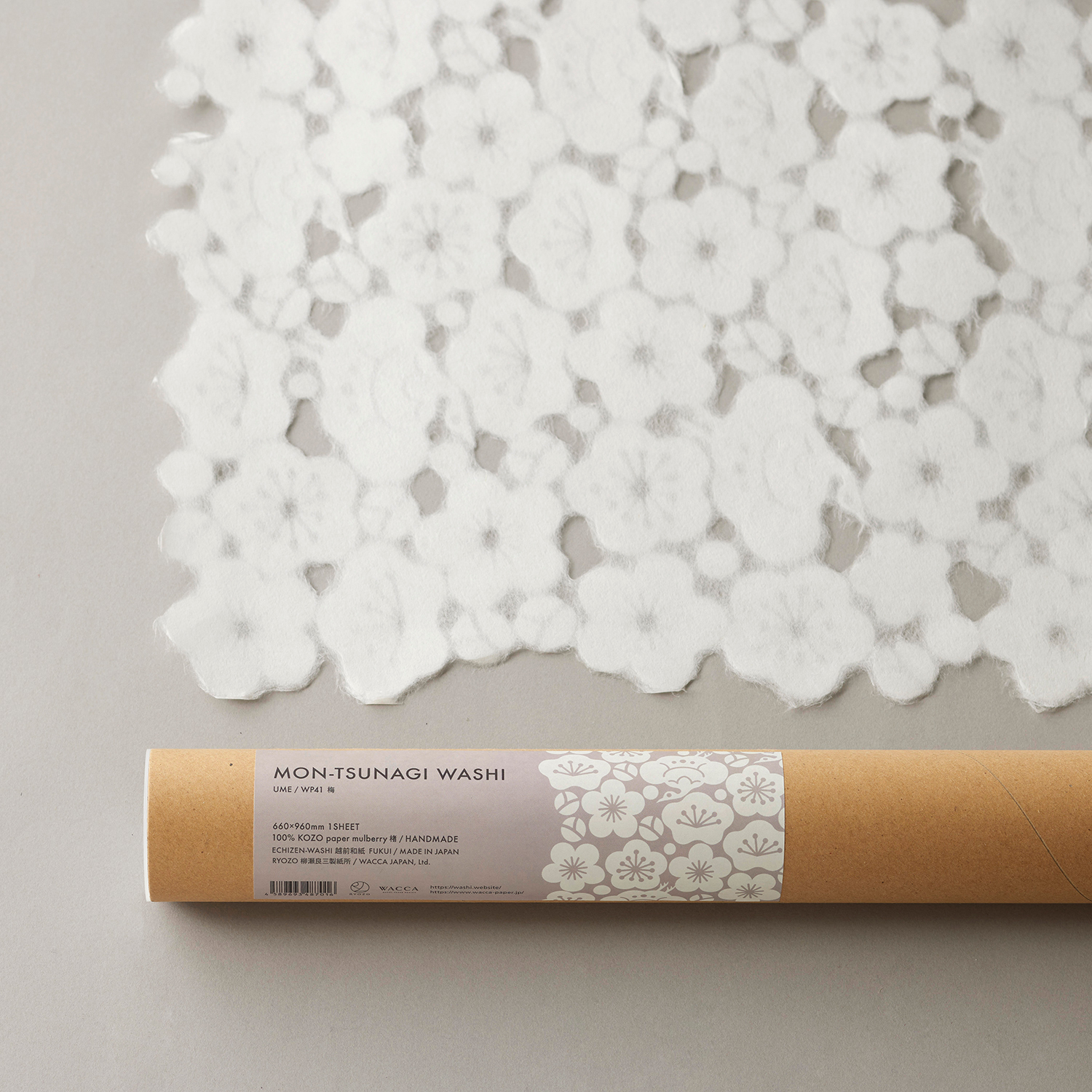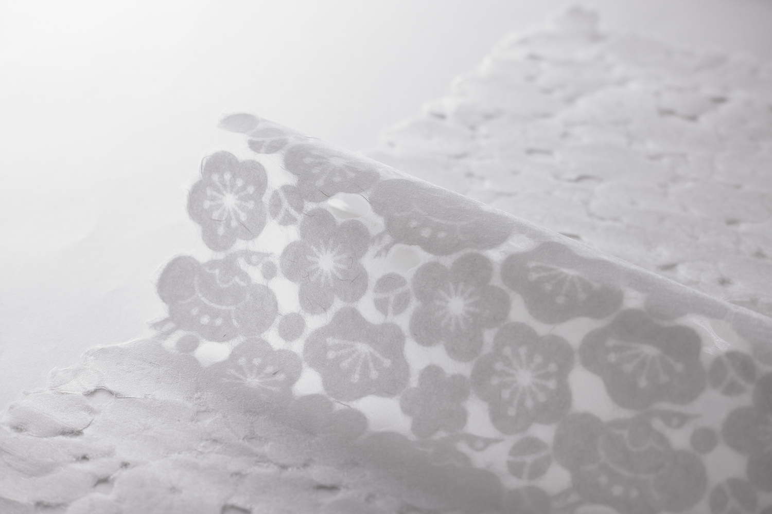 Mon Papier is handmade Japanese paper made from kozo (paper mulberry), with small cut-out motifs interconnected to create a sheet of paper. Each sheet of paper features a distinctive pattern, or mon in Japanese, as kozo fibers organically connect the cut-out motifs, forming a single large sheet of washi. Unlike traditional watermarking techniques or laser cutting, this washi produces unique floating effects. The product was collaboratively developed by the boutique washi brand WACCA and Ryozo Yanase Paper Mills of Echizen Washi in the Fukui Prefecture.