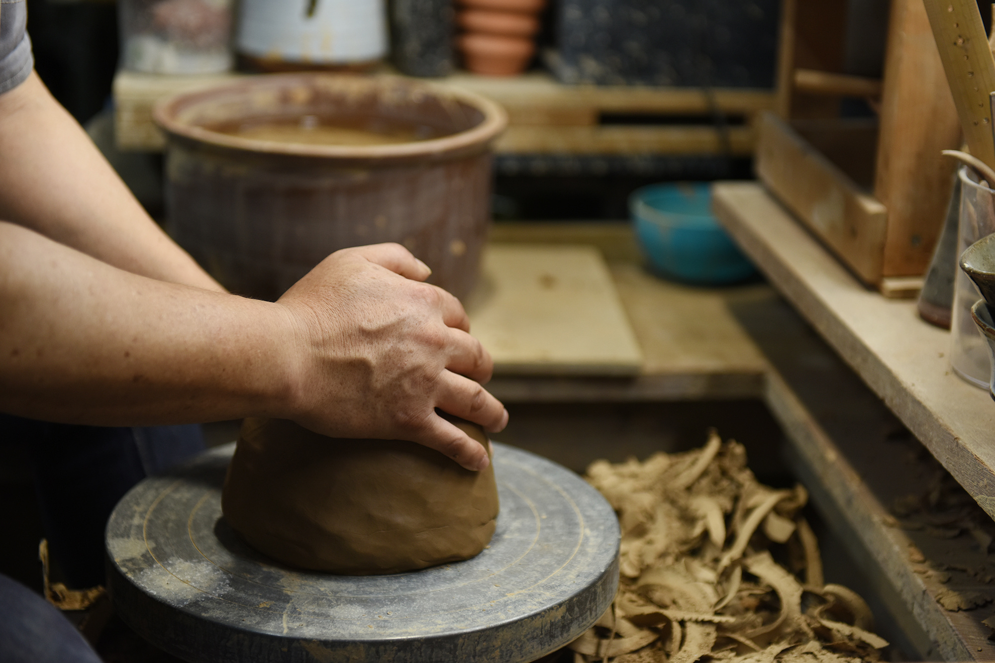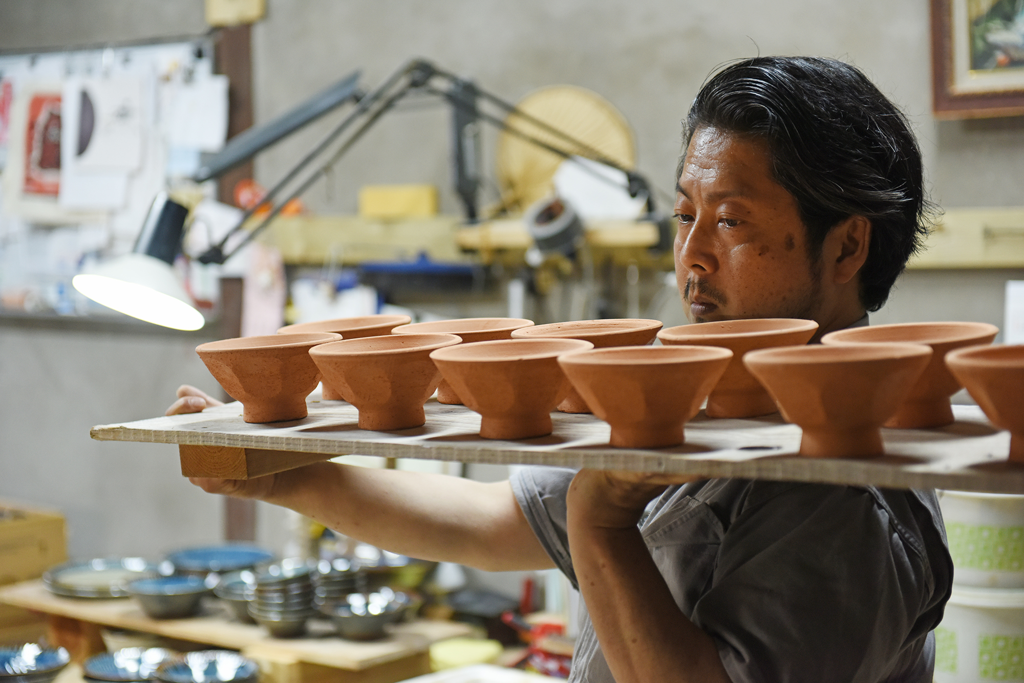 Later, the region was influenced by Kanjiro Kawai, a Japanese ceramist and one of the leaders of the mingei (folk art) movement. Because of that influence, now Tsubaki Gama mostly uses blue glaze called gosu and the red glaze called sinsha that Kawai liked and produces easy-to-use and easy-to-store everyday items using locally available materials. The items have the characteristics of mingei: they are durable and have a certain weight. Tsubaki Gama products are meant for everyday use, but they also make your everyday life a little more special.