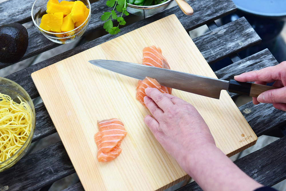 Ukemi is a cutting board made of Japanese cypress, which is specially designed for cutting using sharp Japanese knives. It stays clean and flat for a long time if you wipe it with a dry towel, and let it dry in a well-ventilated place after washing it. When it is worn out, the old surface can be planed and it becomes just like a new one.