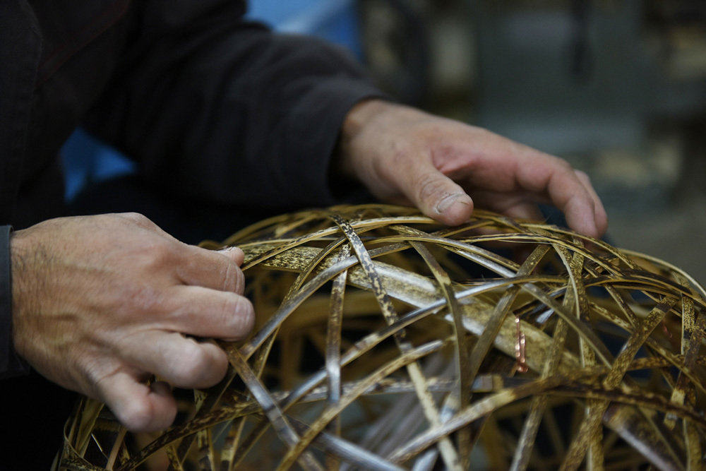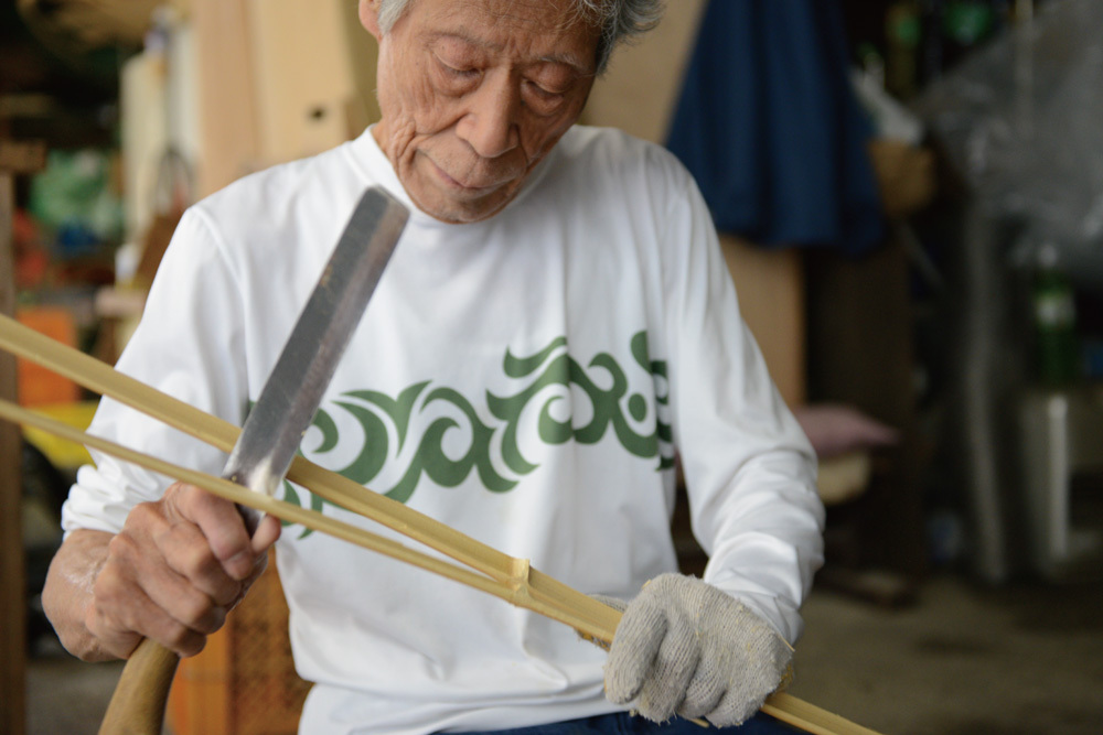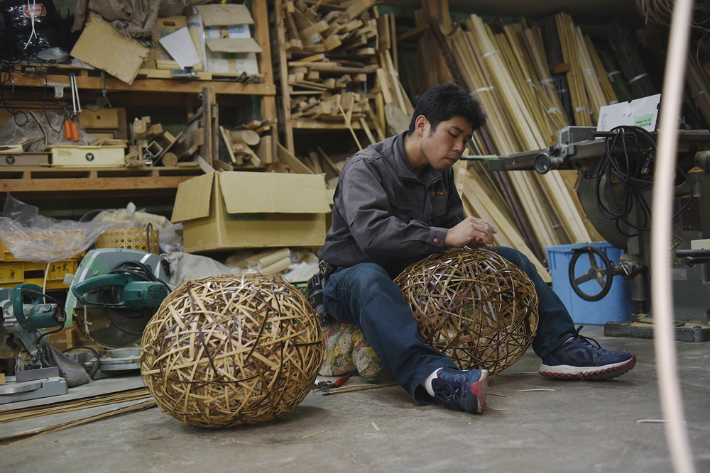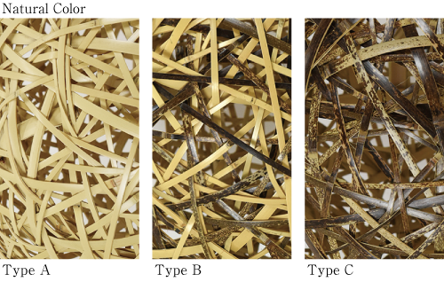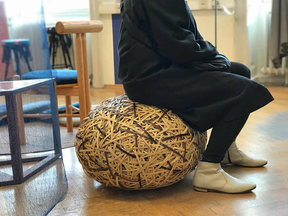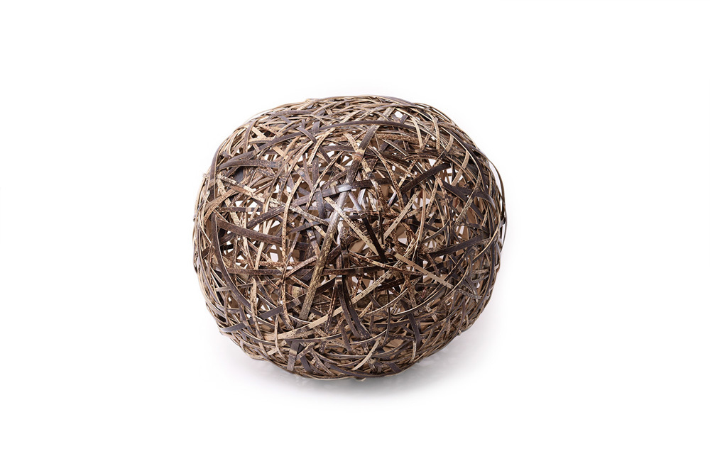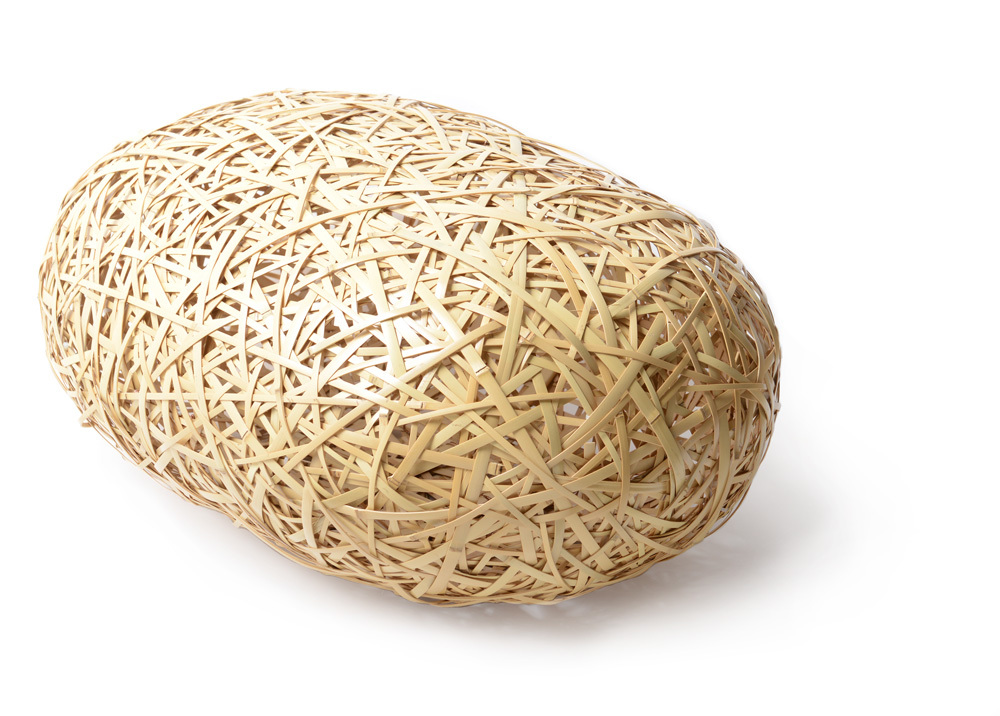 An egg shaped bamboo pouf woven by artisans from Kyoto; very light and sturdy in color variation of three from natural bamboo colors.